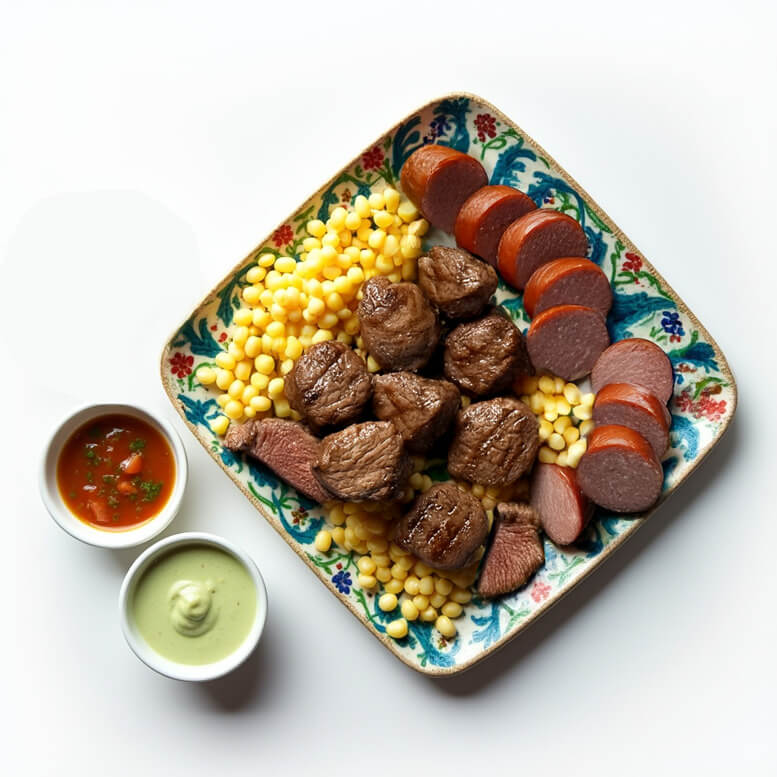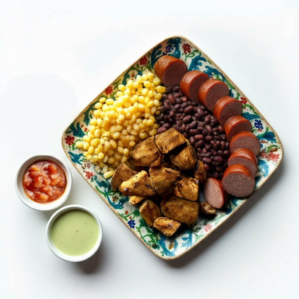 Acompañada de salsas frescas con chorizo, lomo y pollo salteados.