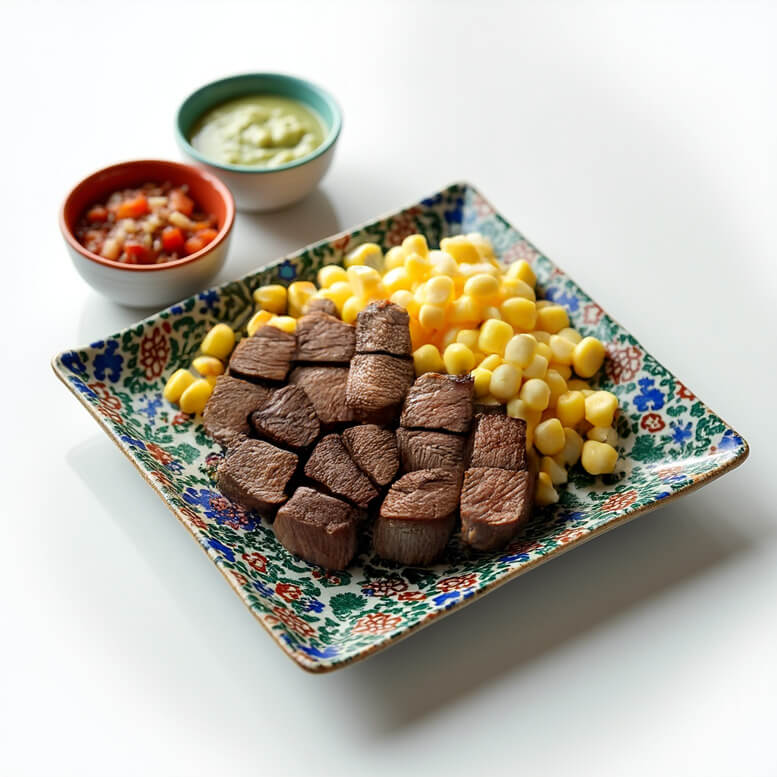 Lomo de asado acompañado de crema de leche, pimientos rojos cocidos, cebolla perla y mayonesa light.