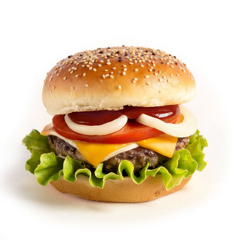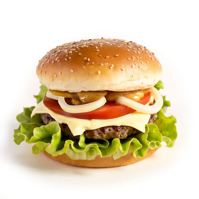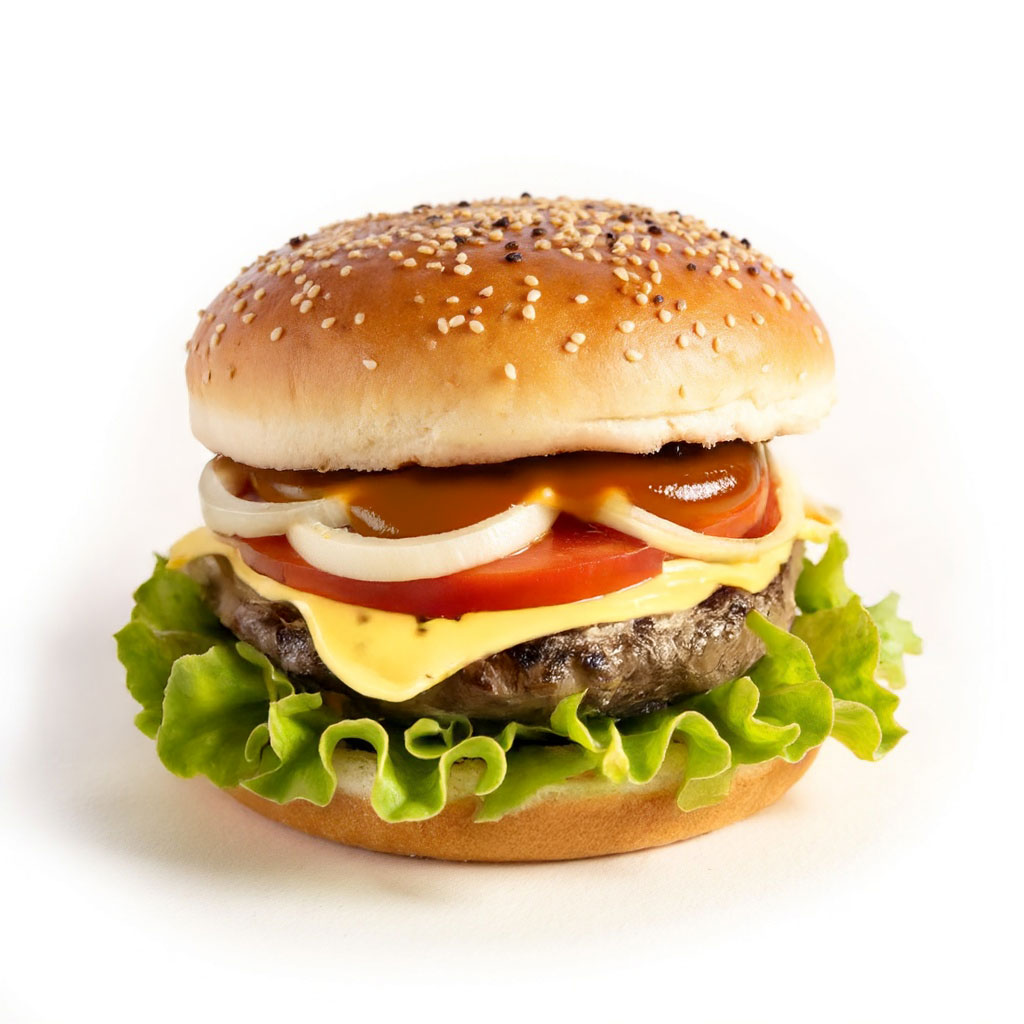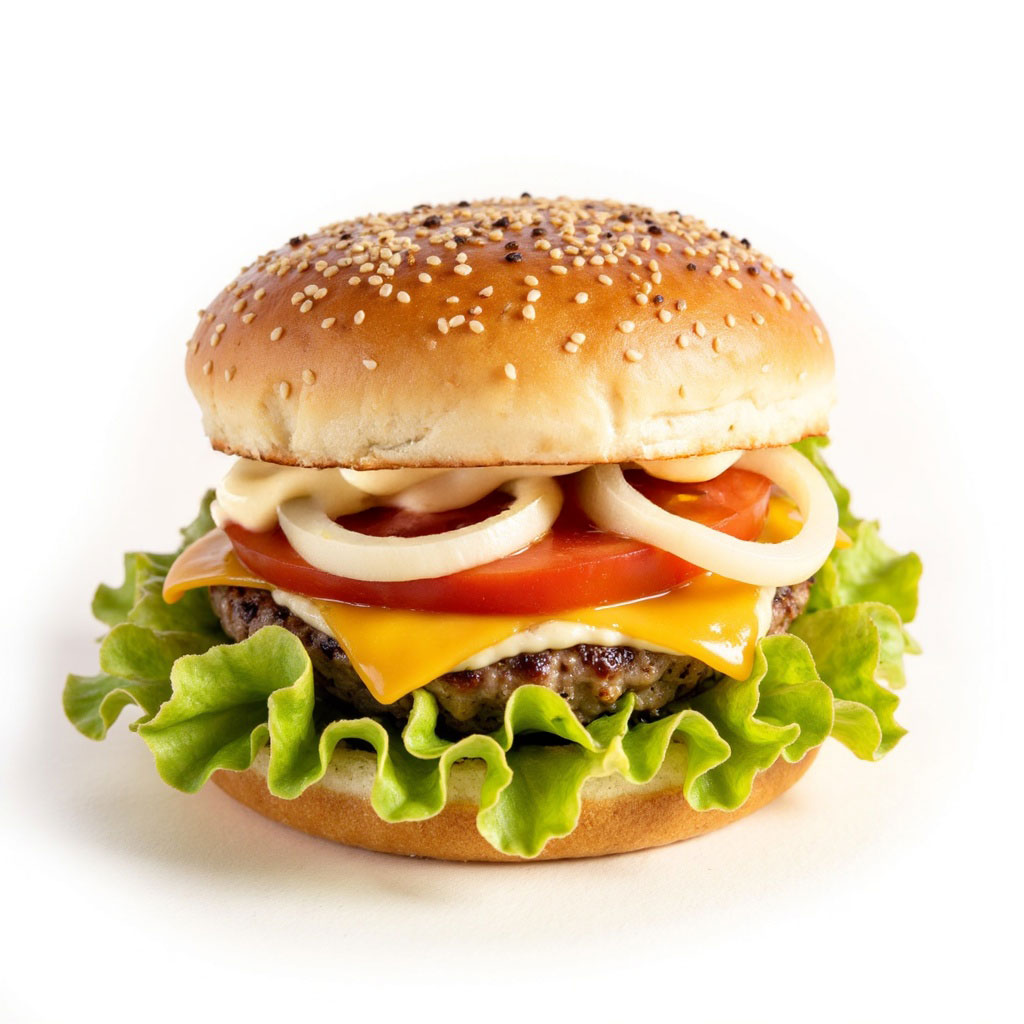 Carne, aros de cebolla perla, queso, lechuga, tomate, mayonesa.