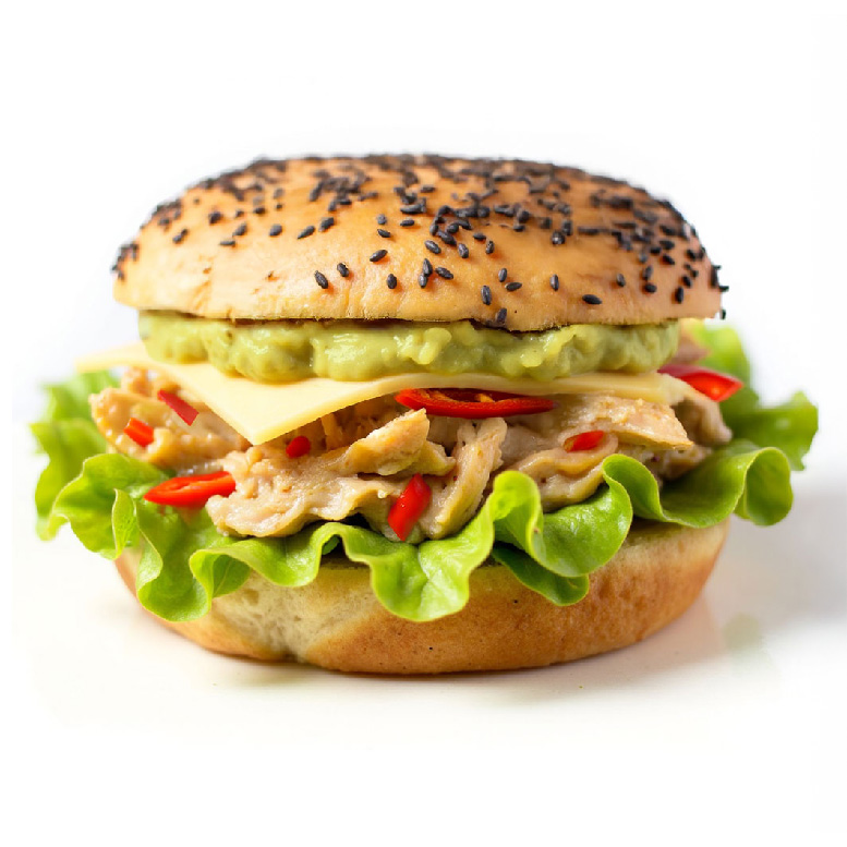 Pollo, queso, guacamole, pimiento rojo, lechuga orgánica y mayonesa de la casa.