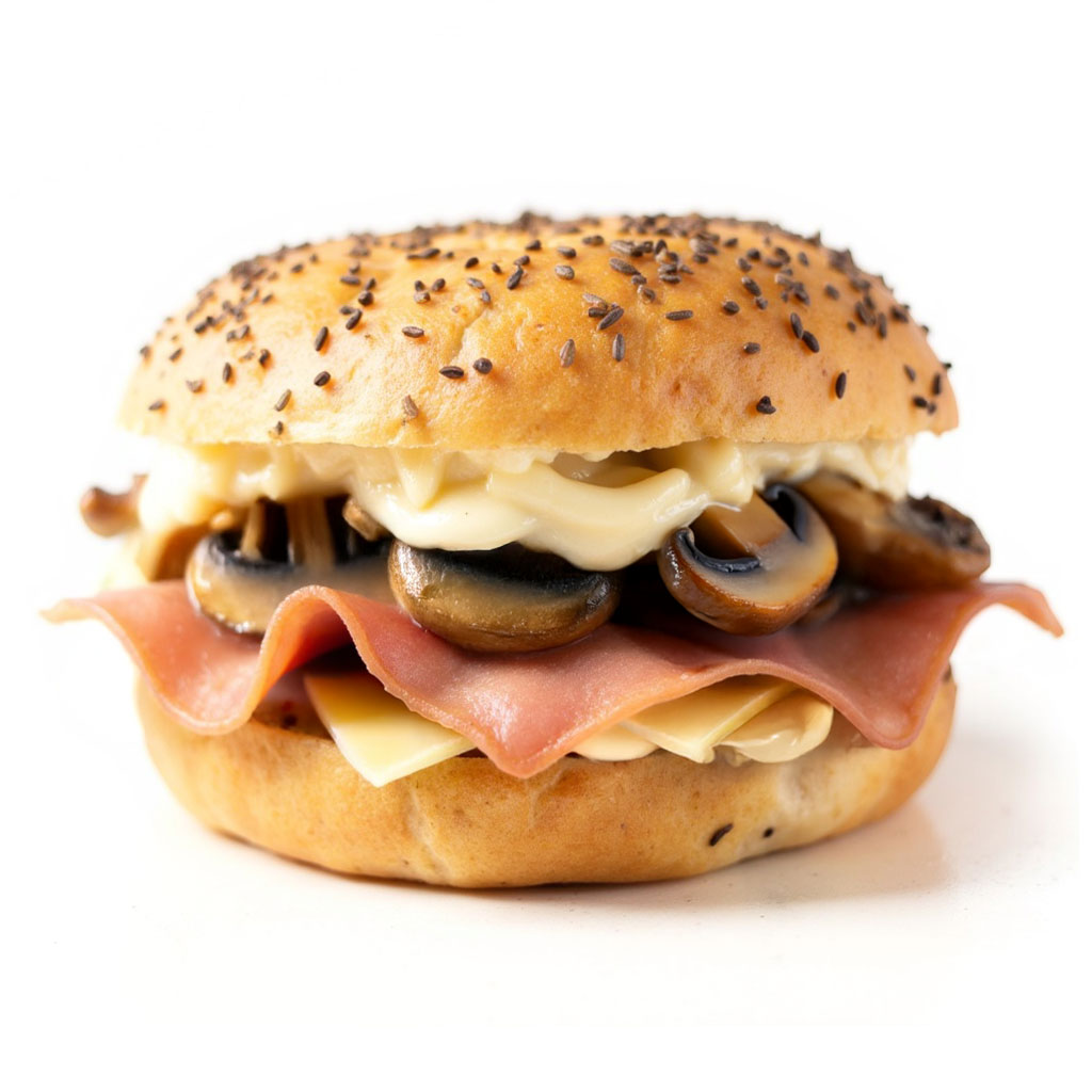 Jamón de espalda, champiñones, queso y mayonesa de la casa.
