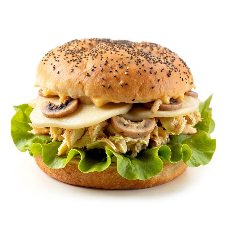 Pollo, queso, champiñones, lechuga orgánica y mayonesa de la casa.